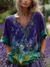 More information about Women's T Shirt Floral Fashion Modern Half Sleeve V Neck Regular Tops Daily Print Purple Summer