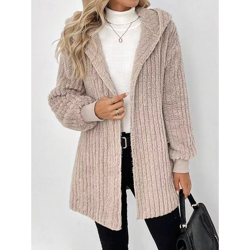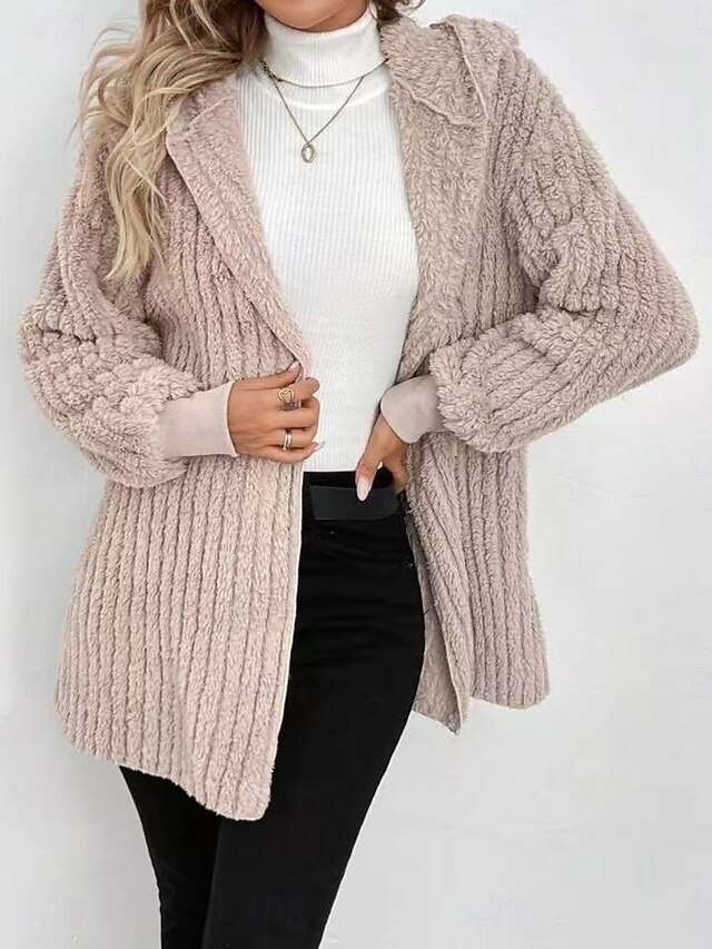 More information about Women's Sherpa Jacket Comfortable Breathable Pocket Open Front Casual Plain Vacation Street Casual Daily Wear Open Front Regular Hooded Regular Fit Long Sleeve Outerwear Khaki Spring Fall