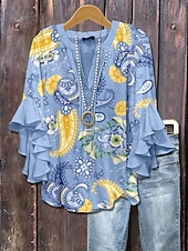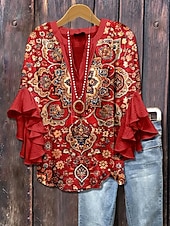 More information about Women's Blouse V Neck Floral Graphic Paisley Elegant Bohemia Ethnic 3/4 Length Sleeve Regular Tops Daily Holiday Vacation Wear Ruffle Print Red Dusty Blue Green Summer Spring Fall