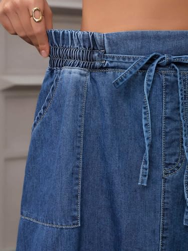 • Features: Loose Fit, Casual Denim Skirt, Elastic Waistband, Drawstring Waist, Midi Length, A Line, Flared Hem, Two Patch Pockets