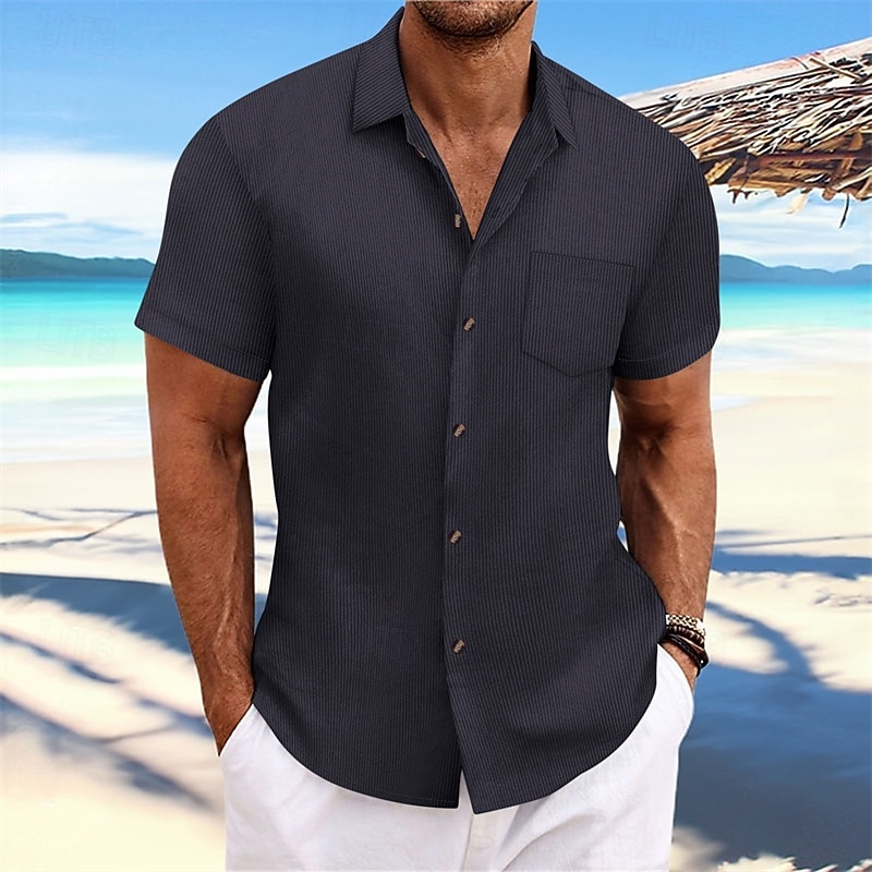 More information about Men's Shirt Summer Shirt Casual Shirt Beach Shirt Button Up Shirt Black Navy Blue Blue Dark Green Brown Short Sleeve Plain Lapel Vacation Hawaiian Jacquard Clothing Apparel Polyester Fashion Casual
