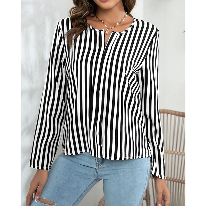 Highlights - Perfect for Spring and Fall seasons - Made from high-quality Polyester fabric - Features Long Sleeves for added comfort - Specifically designed for Women - Offers a mix of Stylish, Basic, and Casual styles - Ideal for Summer as a daily wear or for work - Eye-catching Striped pattern with Print design - Flattering V Neckline for a chic look