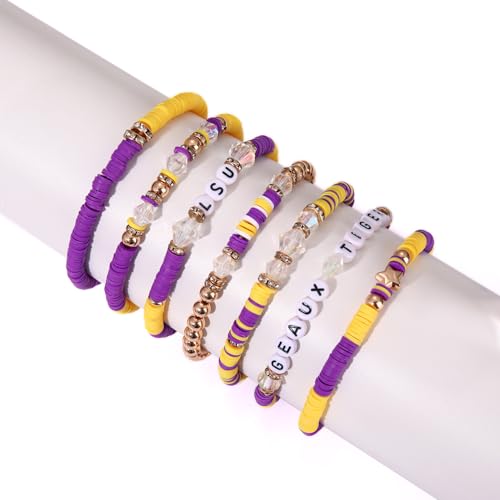 • Football Team Spirit Jewelry Accessory -Show your spirit and love for LSU! Elevate your LSU Tigers spirit with this set of seven vibrant and stylish bracelet packs. Whether you’re a passionate fan, an alum, everyday class look or simply love showing off your Louisiana State University pride, these bracelets are the perfect game days, tailgating, or daily wear. Geaux Tigers!