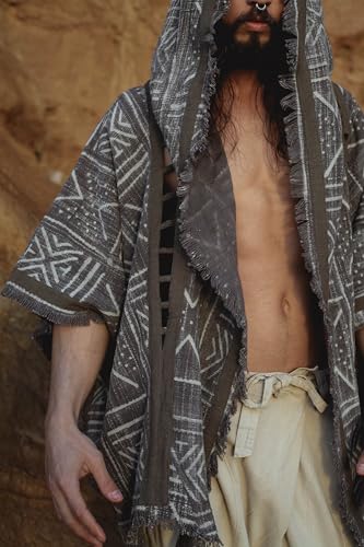 AJJAYA WIZARD Mens Hooded Kimono Vest Grey Tribal Pattern Alchemist Sorcerer Ritual Ceremony Festival Magic Primitive Boho 5