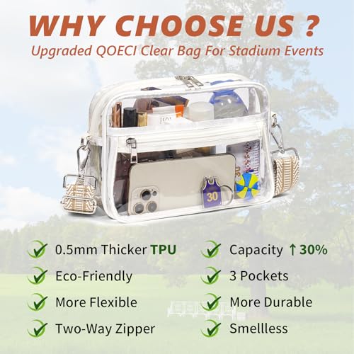 • Great Clear Bag - QOECI clear purses for women stadium crossbody is the best choice for sport fans or concert fans. Our clear stadium bags for women can suit any outfit and match any occasion perfectly. A great clear cross body bag for your family, lover and friends on Birthday, Valentine's Day, Mother's Day, Christmas, Graduation and Anniversary.