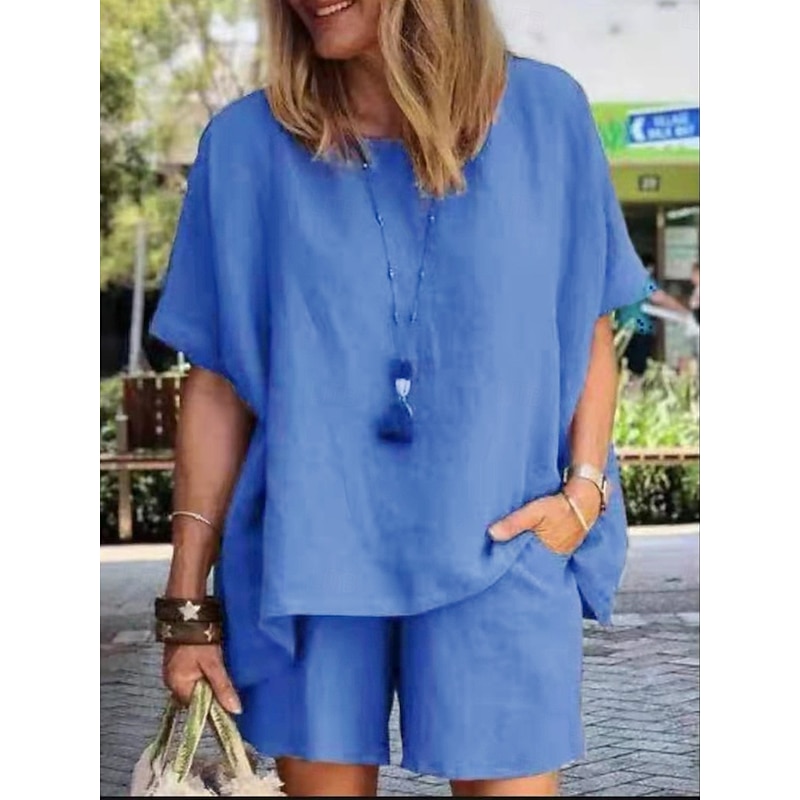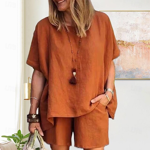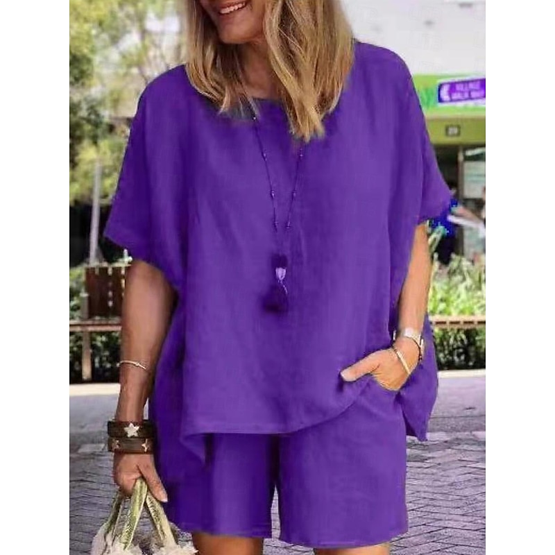 More information about Women's Simple Basic Cotton Linen Sets Two Piece Sets T Shirt Half Sleeve Short Pant Crew Neck Pure Color Pocket Street Daily Black Blue Purple Summer