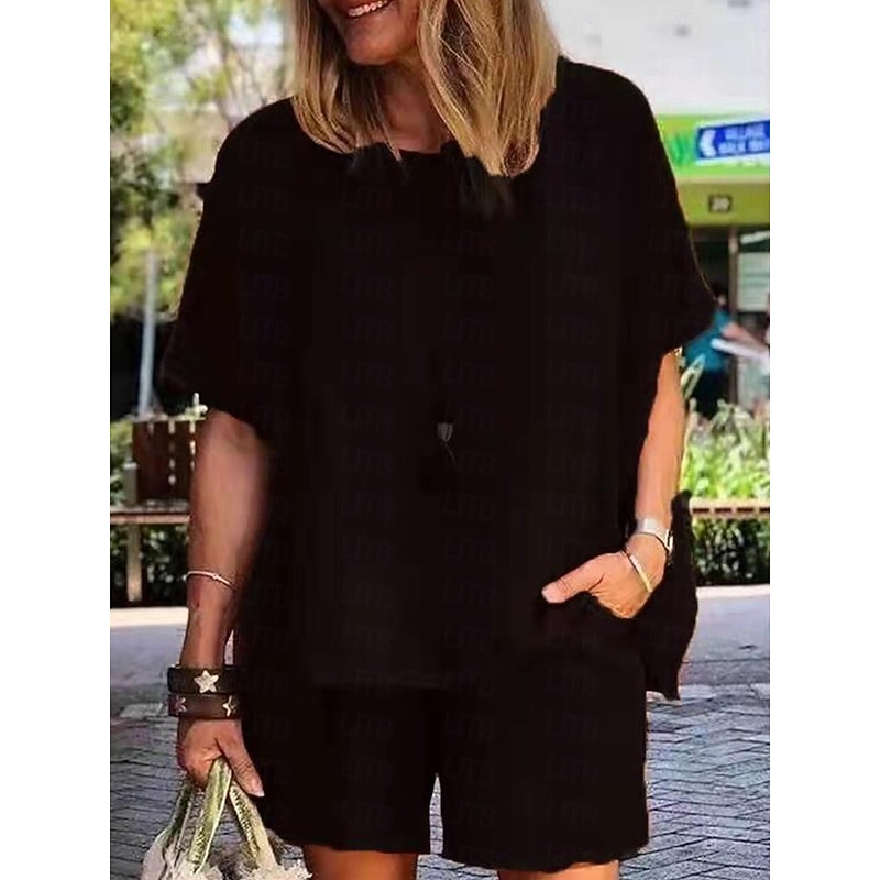 Highlights [Fabric] Crafted from a high-quality cotton and linen blend, this loungewear set is designed for breathability and comfort, making it perfect for spring and summer. The micro-elastic properties ensure a flexible fit that adapts to your movements. [Silhouette] The outfit features a relaxed silhouette with a loose-fitting, oversized top and matching shorts that promote ease and comfort. The top's half sleeves and crew neck provide a laid-back yet contemporary vibe, while the mid-thigh length shorts with an elastic waistband offer a snug and comfortable fit. [Design Highlights] This set boasts functional pockets and a chic, pure color design that elevates its simple yet stylish appeal. The straightforward design emphasizes ease and practicality, making it a go-to choice for casual days. [Occasions] Ideal for daily wear, street style, and loungewear, this set is perfect for leisurely weekends, trips to the beach, or casual strolls around the city. It effortlessly combines style with comfort, making it a versatile addition to any wardrobe. [Size Range] Available in a variety of sizes, from S to 4XL, this versatile set accommodates a wide range of body types, ensuring every wearer enjoys a comfortable and flattering fit.