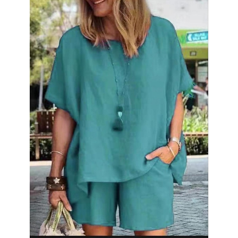 HOT ! Women's Simple Basic Cotton Linen Sets Two Piece Sets T Shirt Half Sleeve Short Pant Crew Neck Pure Color Pocket Street Daily Black Blue Purple Summer