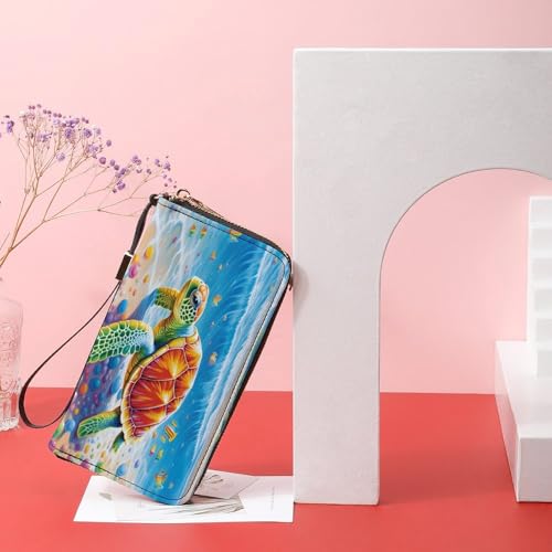 Ocean Animal Sea Turtles Leather Wallet Fashion Bifold Purse Long Pouch with Wrist Strap for Men Women 7