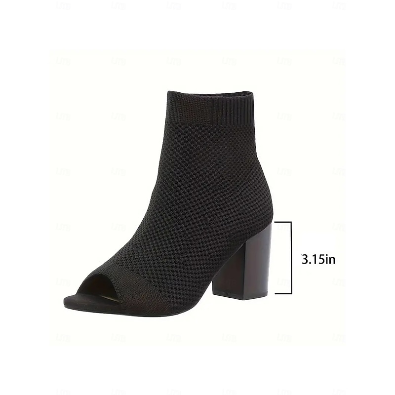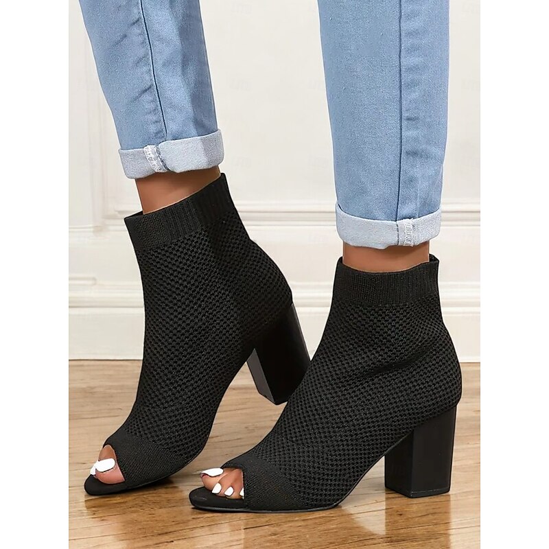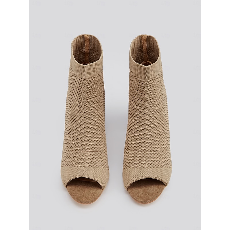 Women's Beige Knitted Peep Toe Ankle Boots – Chunky Heel Sock Booties for Casual Spring and Fall Outfits 17