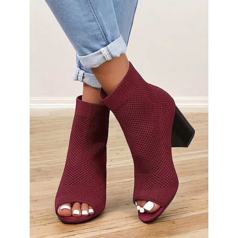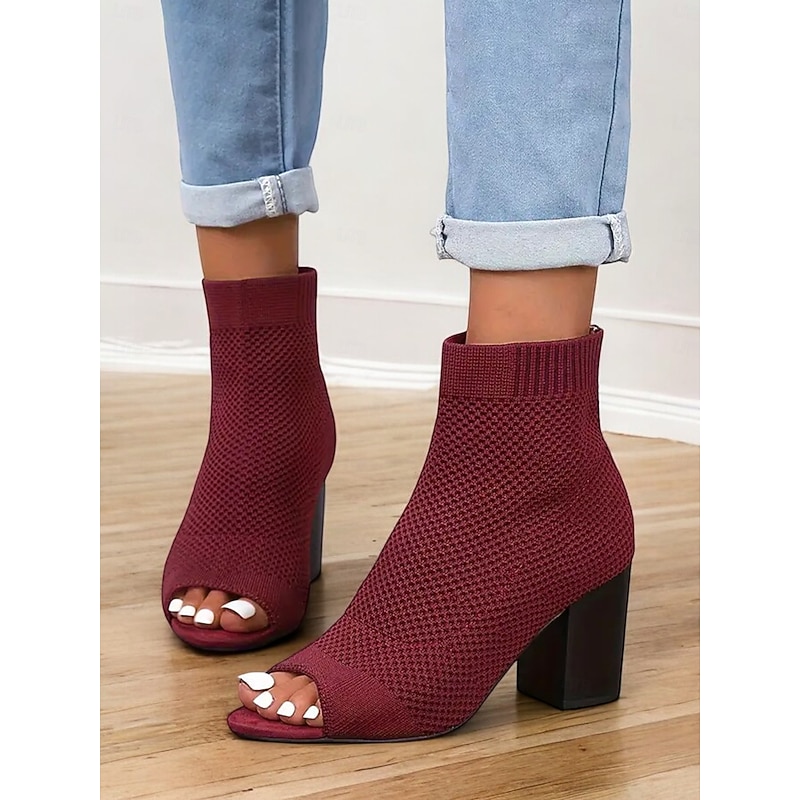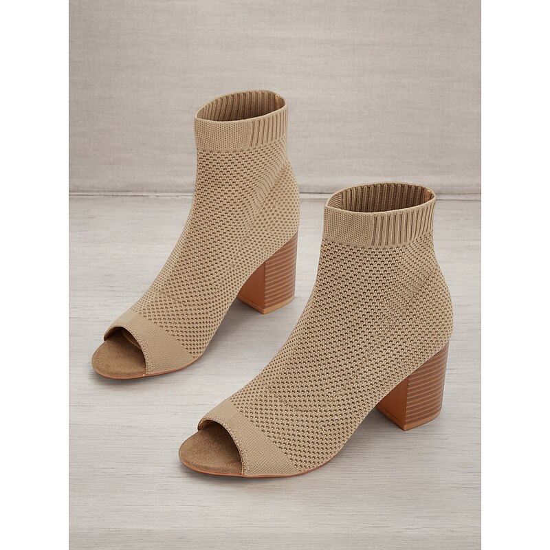 Women's Beige Knitted Peep Toe Ankle Boots – Chunky Heel Sock Booties for Casual Spring and Fall Outfits 12