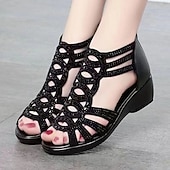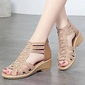 Highlights [Fabric and Materials] These elegant women's cut-out sandals are crafted from high-quality faux leather, ensuring lightweight durability and a sophisticated look. The rubber outsole provides excellent traction and wear resistance, perfect for daily use and outdoor activities. [Style and Fit] Designed with a classic peep-toe style and a versatile wedge heel, these sandals offer a timeless elegance suitable for both casual and dressy occasions. The modest 1-2 inch heel height provides a comfortable lift without sacrificing stability, making them ideal for all-day wear. [Design Highlights] Featuring intricate laser-cut patterns and elegant loops, these sandals boast a chic appeal that adds sophistication to any ensemble. The convenient zipper closure ensures a secure fit while enhancing the overall aesthetic. [Occasions] Perfect for spring and summer, these sandals are ideal for daily wear, outdoor activities, and beach outings. Their elegant design makes them suitable for dressing up casual outfits or complementing more formal attire for events and evenings out. [Size and Fit Recommendations] These sandals are available in a versatile neutral tone, with sizes ranging from US6 to US9 and corresponding UK and EU sizes provided for a perfect fit. This range ensures a suitable option for various foot sizes, catering to a wide audience seeking both style and comfort.