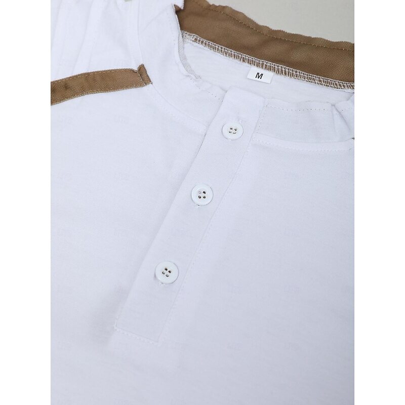 : With a unique patchwork and pleats design, this shirt stands out with its ribbed shoulder detailing. The contrasting, earthy brown trim around the shoulders and button placket adds extra dimension and visual appeal. The Henley neckline with three buttons enhances its classic look and offers a customizable fit.