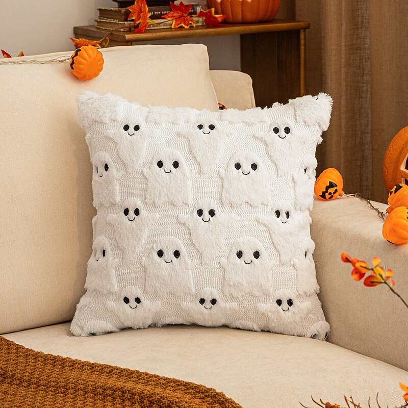 HOT ! Halloween Ghost Decorative Pillow Covers 18x18 , Beige Soft Plush Faux Fur Farmhouse Throw Cushion Cases for Fall Autumn Holiday Home Decorations