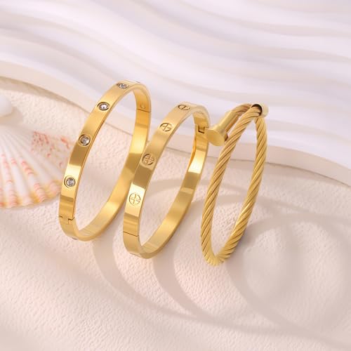 • MINIMALIST GOLD BRACELET SET : Includes exquisite gold love bangle, friendship bracelet, and nail bracelet, all crafted with a simple yet elegant design. Each piece can be worn alone for subtlety or stacked with other chains for a trendy layered look, providing abundant choices to match your varied outfits.