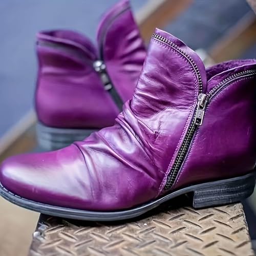 Women's Vintage Casual Short Ankle Boots, Ankle Boots for Women 2025 Arch Support Fashion Low Heel Side Zipper Retro Leather Booties Chelsea Boots Women Comfortable Slip On Flat Shoes 4
