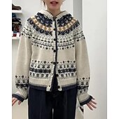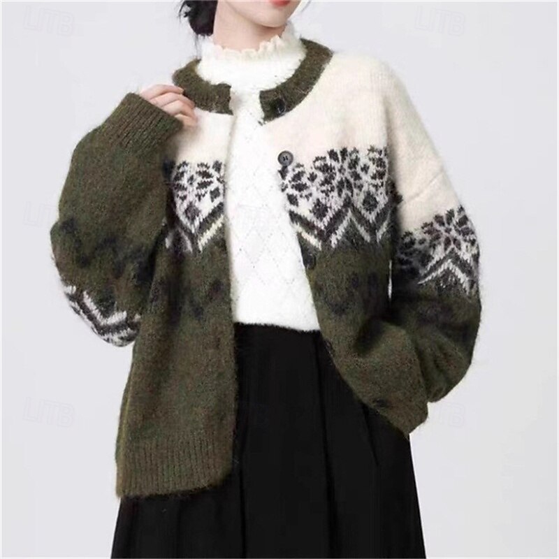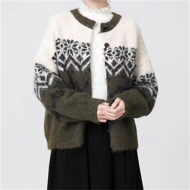 More information about Women's Sweater Cardigan Fair Isle Sweater Vintage Fashion Casual Snowflakes Ribbed Crew Neck Buttons Knitted Print Long Sleeve Regular Tops Knit Christmas Outdoor Daily Army Green Fall Winter