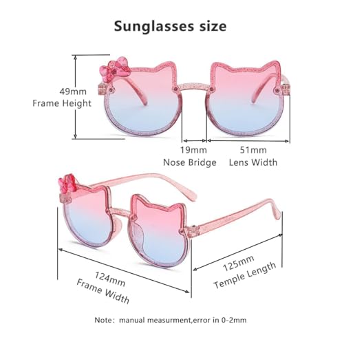• SUNGLASSES DIMENSION - Cat shape lens: 2.16 x 1.97inch/ 5.5 x 5cm (L*W), ; total length of glasses length: 4.9 inch/12.5cm, frame leg: 4.9 inch/12.5cm, suitable for kids 3-10 years old.