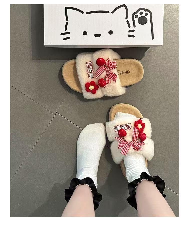 ZQW Plush Fuzzy Cartoon Slippers Y2K Bow Floral Chunky Platform Slides Non-Slip Comfortable Casual Dressy Shoes for Women 5