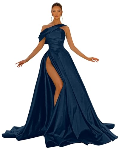 HOT ! One Shoulder Prom Dresses for Women Satin Long Ball Gown with Slit Ruched Formal Evening Dresses