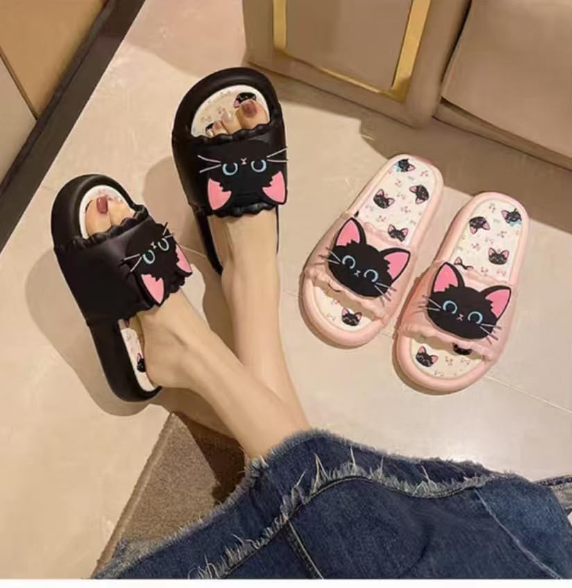 HOT ! Cute Black Cat Summer Slides, Indoor Outdoor Slippers with Cat Face Design, Black and Pink