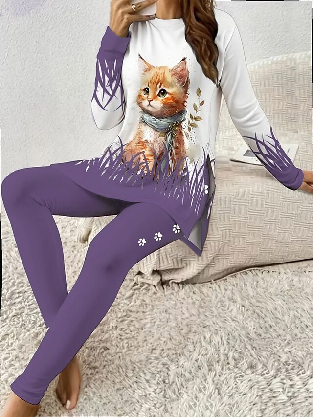 Women's Pajama Set Loungewear Round Neck Long Sleeve Casual Fashion Pants Sets Graphic Animal Cat Print Daily Daily Blue Purple Green Regular Fit 2