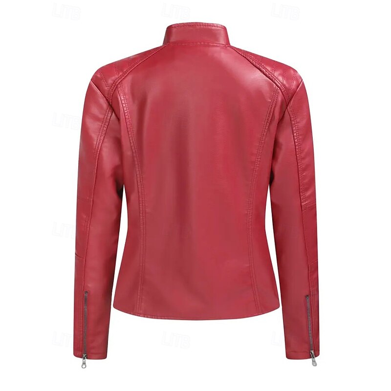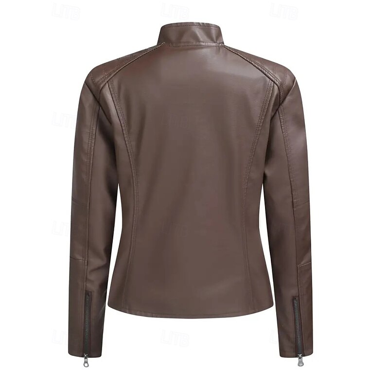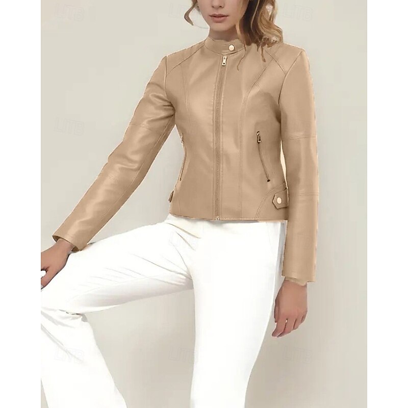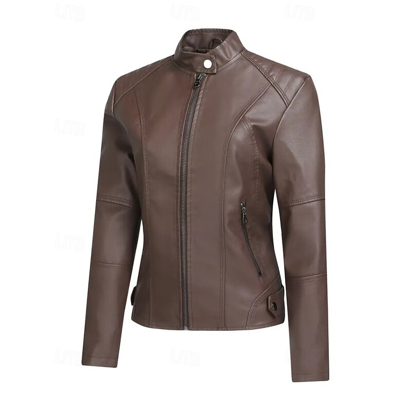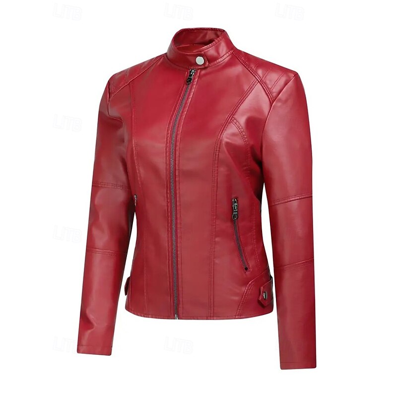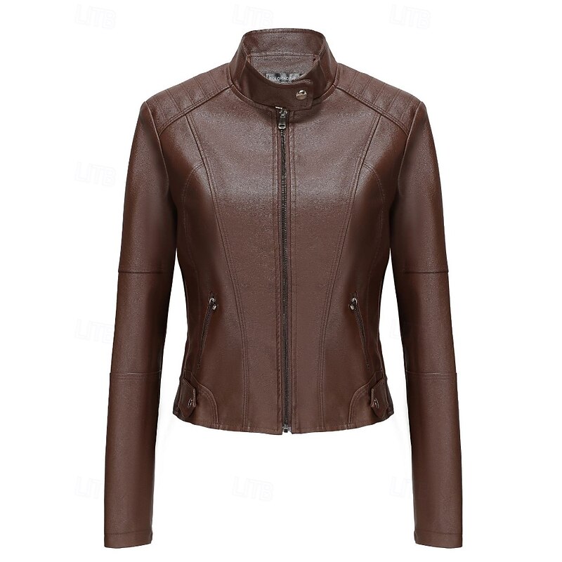 More information about Women's Faux Leather Jacket Comfortable Zipper Pocket Casual Plaid Vacation Going out Weekend Short Stand Collar Regular Fit Long Sleeve Outerwear Black Red Camel Fall Winter