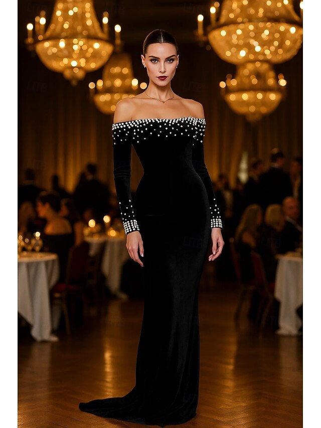 trending ! Black Tie Stretch Velvet Mermaid / Trumpet Evening Gown Elegant Dress Pearls Formal Wedding Sweep / Brush Train Long Sleeve Off Shoulder 2025
