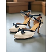 More information about Women's Champagne Satin Ballroom Dance Shoes with Black Bow Accent, Cross Straps, Closed Toe, Mid Heel - Professional Performance Footwear for Latin and Standard Competitions
