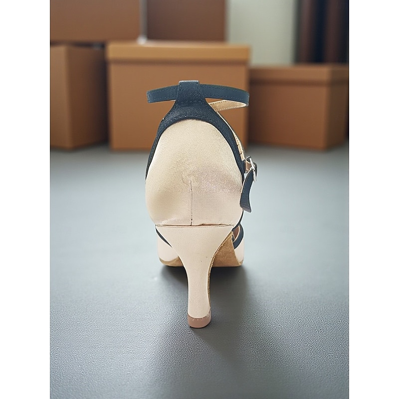 Women's Champagne Satin Ballroom Dance Shoes with Black Bow Accent, Cross Straps, Closed Toe, Mid Heel - Professional Performance Footwear for Latin and Standard Competitions 4