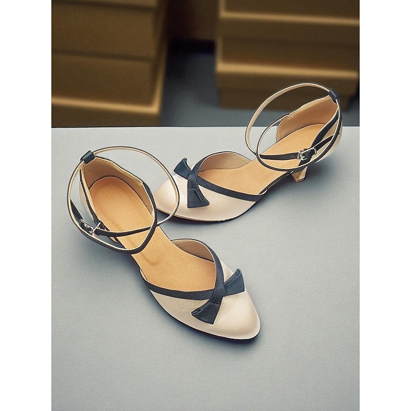 HOT ! Women's Champagne Satin Ballroom Dance Shoes with Black Bow Accent, Cross Straps, Closed Toe, Mid Heel - Professional Performance Footwear for Latin and Standard Competitions
