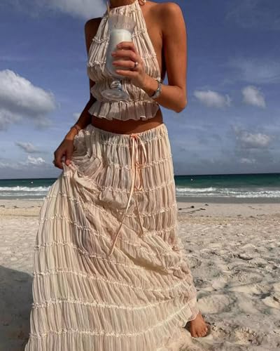 Women 2 Piece Ruffle Maxi Skirt Set Y2k Front Tie Up Tank Top Flowy Ruffle Long Skirts Summer Beach 2Pc Outfits 6