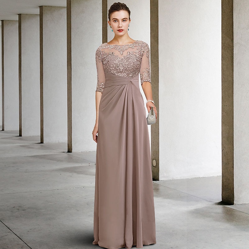 More information about Sheath Mother of the Bride Dress Wedding Guest Elegant Plus Size Jewel Neck Floor Length Chiffon Lace Short Sleeve with Appliques Side-Draped