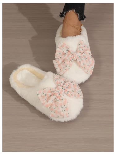 HOT ! OYOANGLE Women's Floral Print Bow Decor Round Toe Faux Fur Slippers Comfortable Fuzzy Warm Slippers