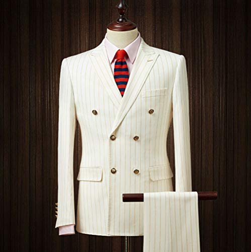 Men's Double Breasted Pinstripe Ivory with Gold Strip Suit Slim Fit Peak Lapel Wedding Tuxedo Sets 6
