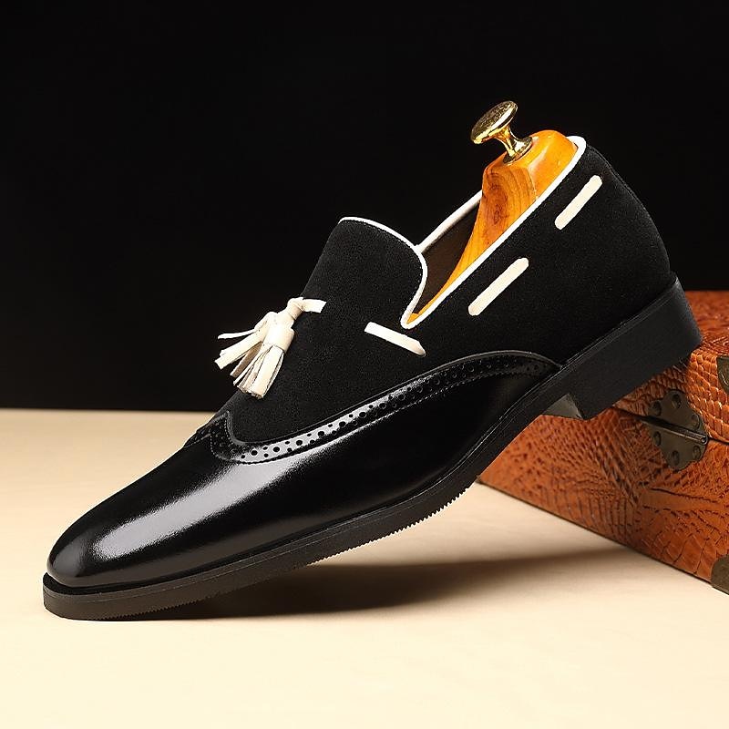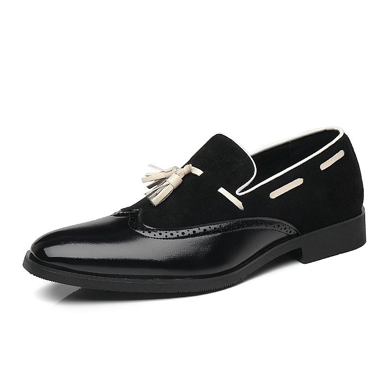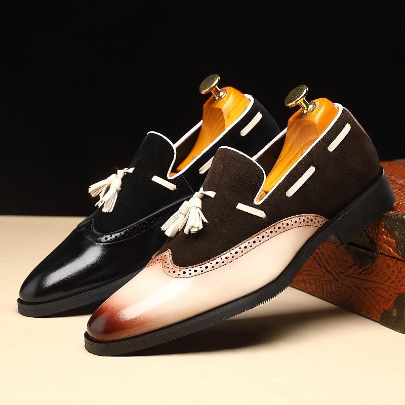 Highlights [Fabric] : Crafted from premium faux leather, these men's loafers offer a rich suede-like texture, balancing softness with durability. The breathable design ensures all-day comfort, making them suitable for warm-weather wear. [Silhouette] : Featuring a sleek slip-on silhouette, these loafers provide ease of wear while maintaining a polished look. The square toe shape adds a modern touch, blending classic design with contemporary style. [Design Highlights] : These loafers are embellished with tassels and decorative perforations, showcasing traditional brogue detailing. The color block pattern transitions smoothly from dark brown to a lighter shade, adding visual interest and sophistication. [Occasions] : Perfect for both business and casual settings, these loafers are versatile enough for daily wear, outdoor activities, and social gatherings. Whether you're heading to the office or enjoying a weekend outing, they complement any ensemble effortlessly. [Size Range] : Available in sizes US6 to US12, including half sizes, these loafers cater to a wide range of foot sizes, ensuring an optimal fit for everyone.