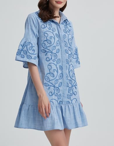 Kedera Women's Summer Button Down Shirt Embroidered Dress Ruffle Sleeve Shift Mini Dresses with Pockets 5