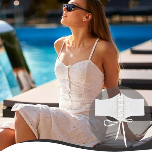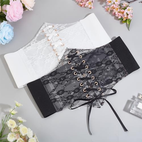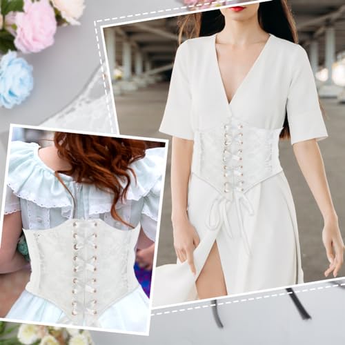ADJUSTABLE SIZE: The full length of the waistband: 27.17 inch/69cm. Width: 4.72~7.87inch/12~20cm. Suitable waist circumference: 27.55~31.49inch/70~80cm. Adjustable size for most women and girls.EXQUISITE LACE & TIE BELT: The White Vintage Lace-up Elastic Wide Corset Waist Belt is made of sheer lace crochet, exquisite workmanship. The tie is made of velvety satin ribbon material, which allows you to tie a pretty bow to add decoration to your dress and emphasize your waistline.HIGH ELASTICITY & METAL SNAP CLOSURE: The Lace Elastic Corset Waist Belt is made of superior elastic band that fits your waist comfortably. Metal snap closure on the back make it easy to put on and take off.EASY TO PAIR: The Vintage Lace-up Wide Corset Waist can be long shirts, dresses, t-shirts, gowns, stage performance costumes, cosplay costumes, etc., can meet your daily or party wear. Perfect gift for your wife or female friends on birthday, anniversary, Valentine's Day, Christmas, etc.WIDELY APPLICABLE: The Lace-up Waist Corset Belts can be used for proms, parties, banquets, important ceremonies, friends gatherings, wedding parties, Halloween parties, Christmas parties, masquerade parties, music parties, clubs, stage performances and so on. Perfect for everyday use. High quality materials and excellent craftsmanship ensure long-lasting durability.