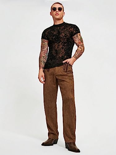 WDIRARA Men's Floral Print Mesh Sheer Stand Collar T Shirt Short Sleeve Slim Fit Tee Top 5