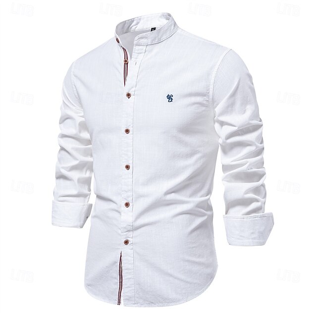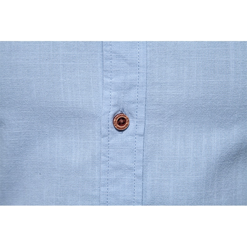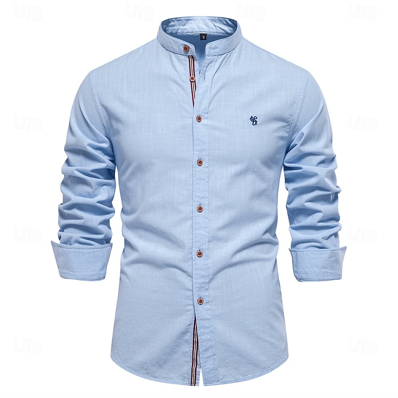 Featuring a contemporary mandarin collar, this shirt adds a modern twist to a timeless piece. Wooden-look buttons adorn the front, offering a unique contrast to the plain fabric. Subtle embroidered details on the chest enhance the shirt's simplicity with a hint of elegance. Long sleeves can be rolled up for a more laid-back vibe, and a striped inner placket provides a touch of character when left slightly unbuttoned.