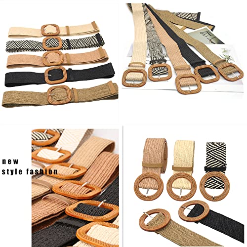2 Pieces Women Straw Woven Elastic Stretch Waist Belt for Flowy Fashion Skinny Dresses with Braided Wooden Buckle 7