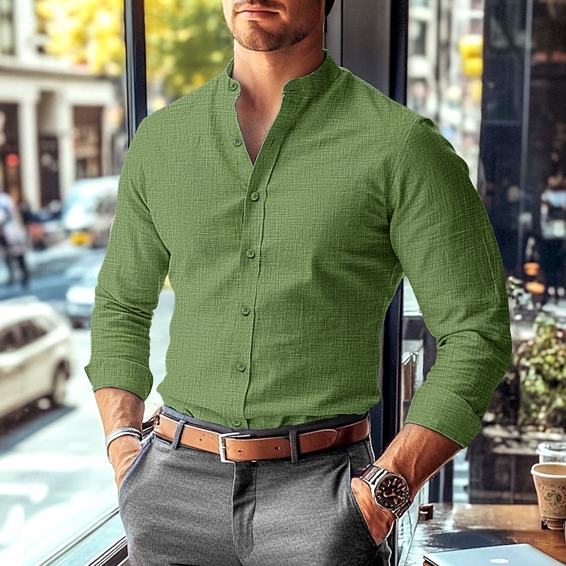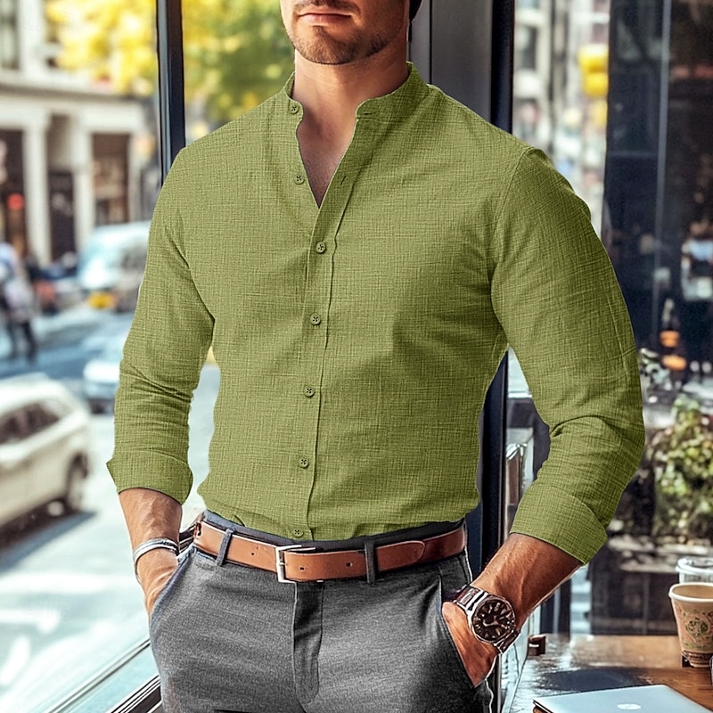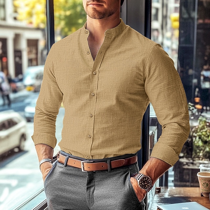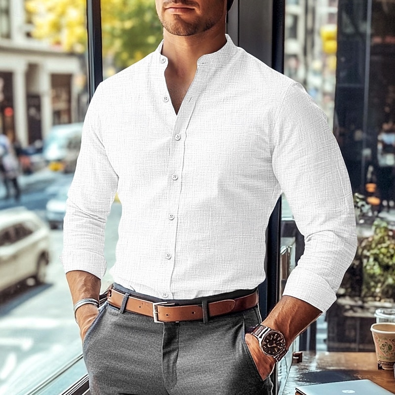 More information about Men's Shirt Band Collar Shirt Summer Shirt Dress Shirt Button Up Shirt Solid Color Work Wear to work Black White Pink Blue Long Sleeve Collar Clothing Apparel