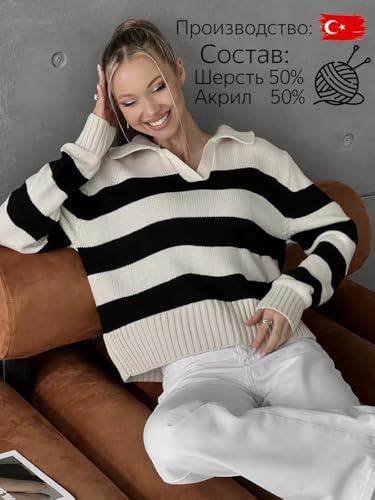 More information about Polo V-Neck Knit Sweater Striped Color Block Loose Long Sleeve Top Casual Fashion Pullover Sweaters for Women