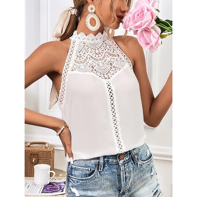 More information about Women's Camisole Tank Top Solid Color Stylish Casual Sleeveless Sleeveless Crew Neck Regular Tops Work Daily Going out Lace Black White Summer Spring