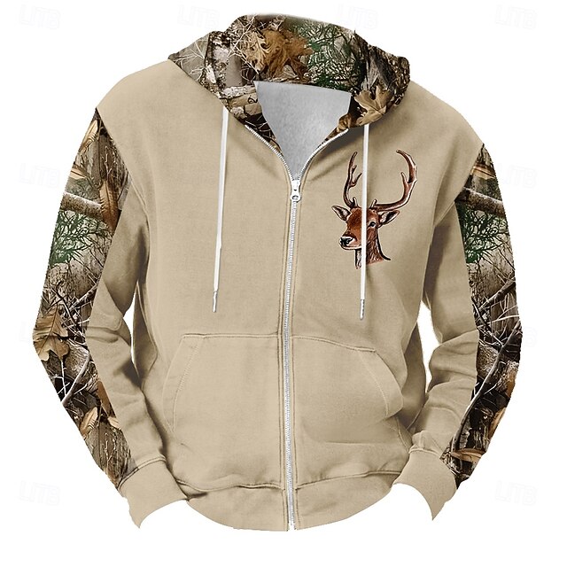 Men's Camo Deer Hoodies Fashion Daily Long Sleeve Hooded Vacation Hunting Black Brown Drawstring Zipper Fall Winter Designer 1