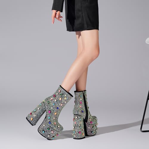 trending ! Tsrenlmln Women's Rhinestone Platform Boots for Women Round Toe Sparkly Ankle Boots for Women With Chunky Heel