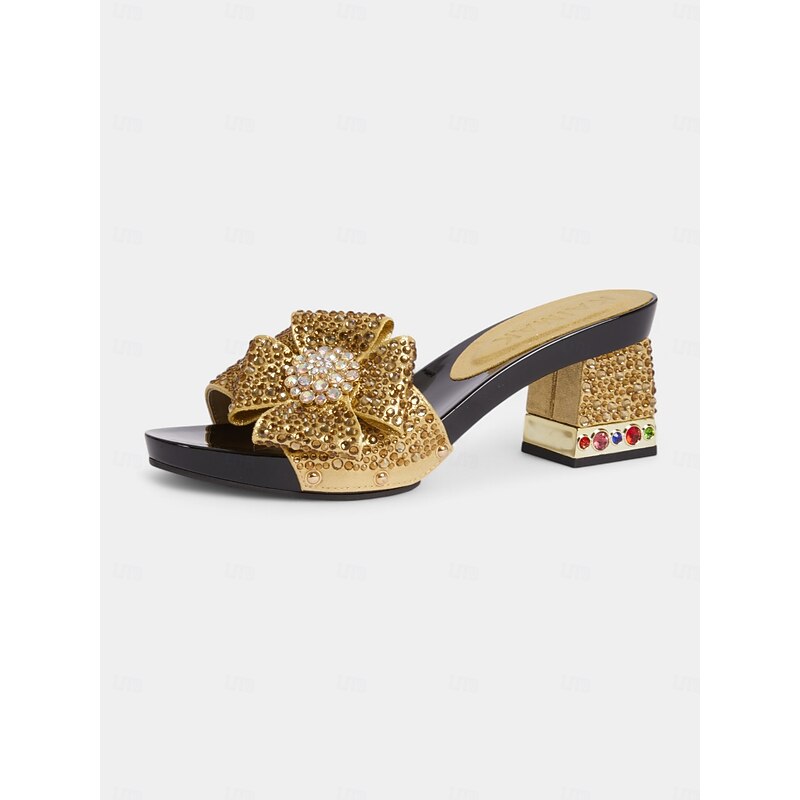 Highlights Enhance your look with these sparkling glitter heels adorned with rhinestones. Featuring a stylish chunky heel and an open toe design, these shoes are perfect for any occasion. Made with a durable rubber outsole for all-day comfort and support.