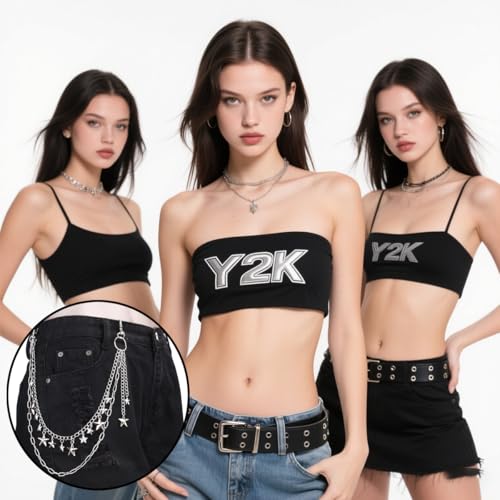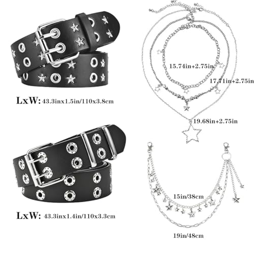 • Y2K Accessories Set: 2pcs Black Studded Belt, 1pcs Necklaces, 1pcs Star Pants Chain.