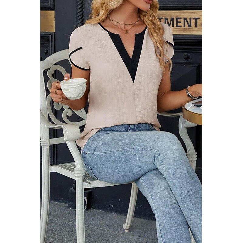 More information about Women's Blouse Color Block Modern Casual Short Sleeve V Neck Regular Tops Holiday Going out Patchwork Black White Green Apricot Summer