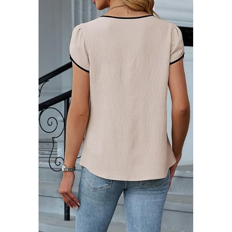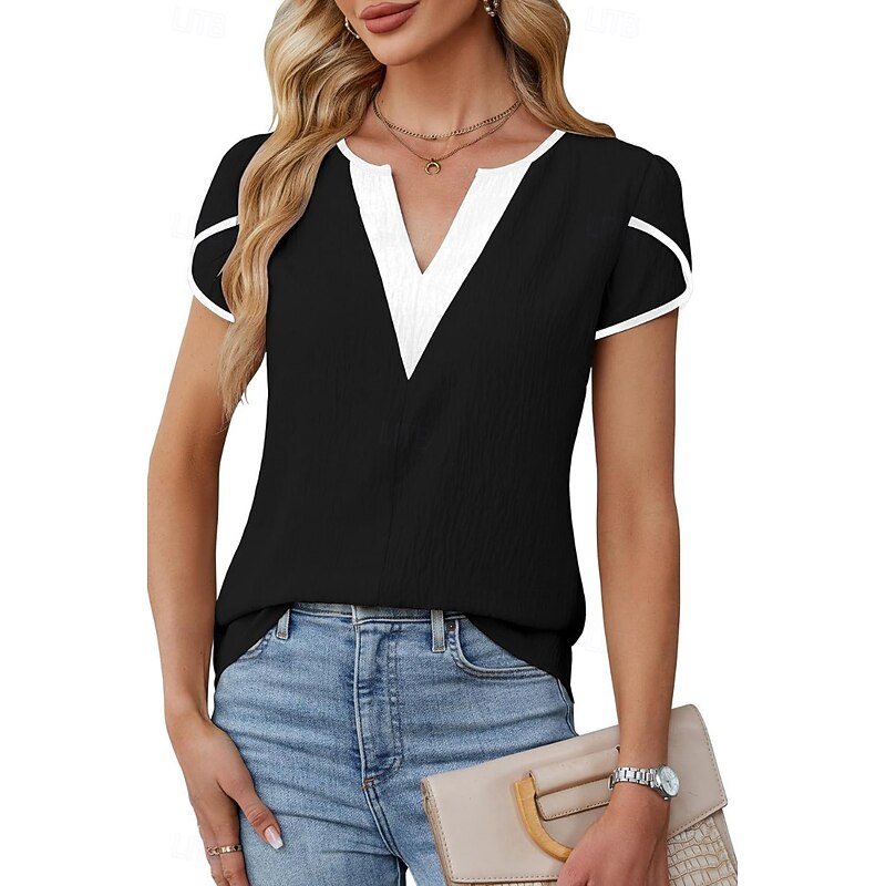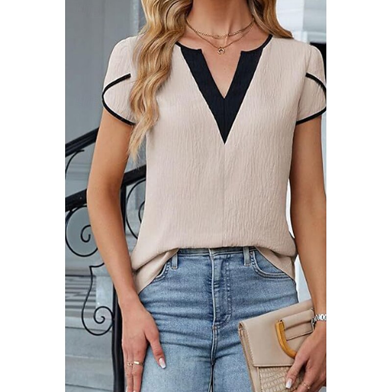 Women's Blouse Color Block Modern Casual Short Sleeve V Neck Regular Tops Holiday Going out Patchwork Black White Green Apricot Summer 25